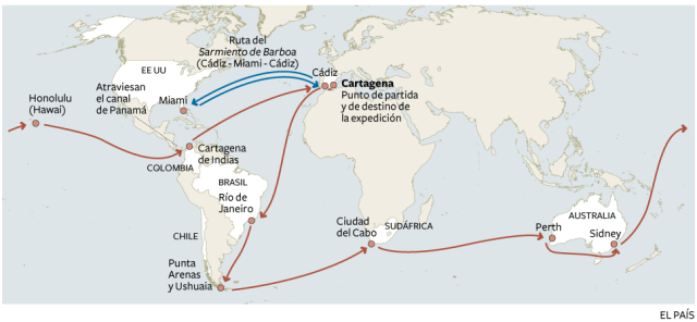 Navegaremos durante 10 meses, siete de ellos a bordo del buque Hespérides de la Armada Española, que circunnavegará la Tierra, y tres de ellos a bordo del buque Sarmiento de Gamboa del Consejo Superior de Investigaciones Científicas que realizará un estudio detallado del Océano Atlántico.