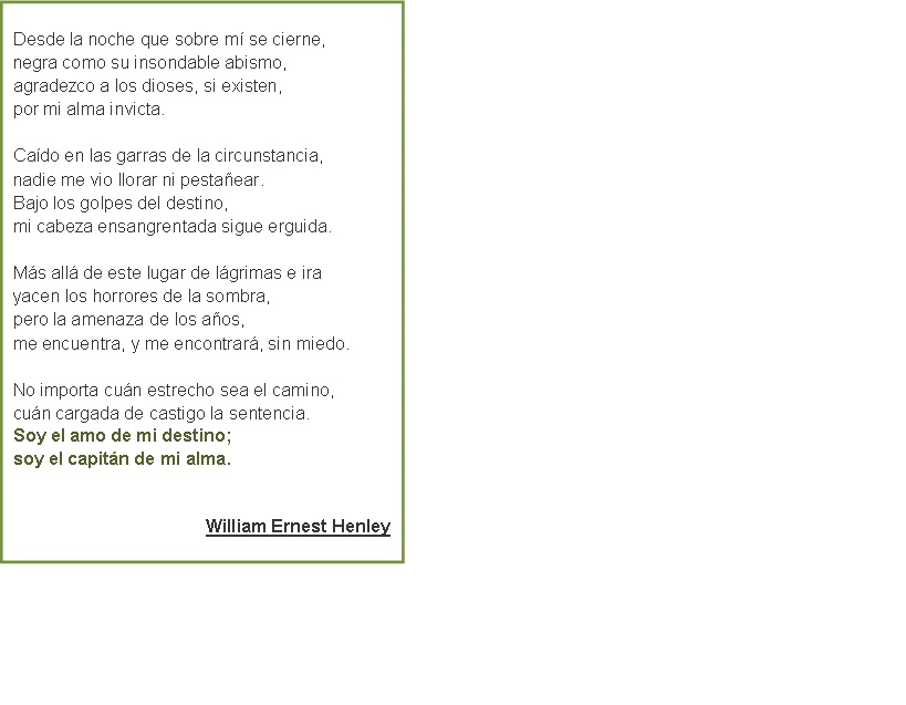 Versos de William Ernest Henley, del poema «Invictus», que fueron los versos de cabecera de Nelson Mandela, sobre todo durante los cuarenta años que estuvo encarcelado.