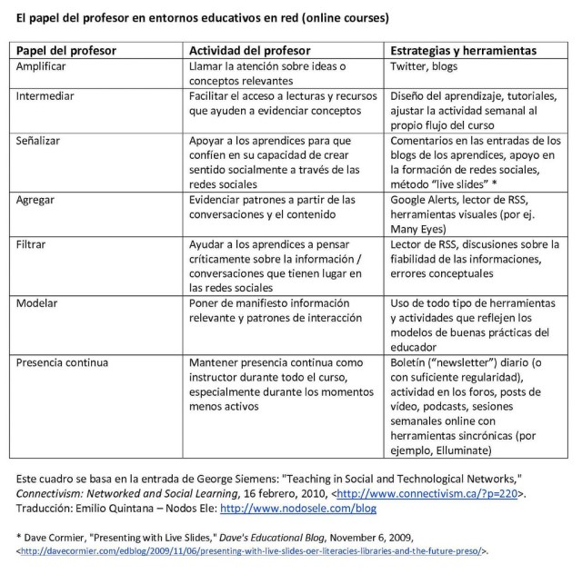 Sencilla y clara tabla de los papeles del docente en los entornos educativos en red, en la que se vinculan el papel y la actividad del profesorado con las herramientas que puede utilizar.