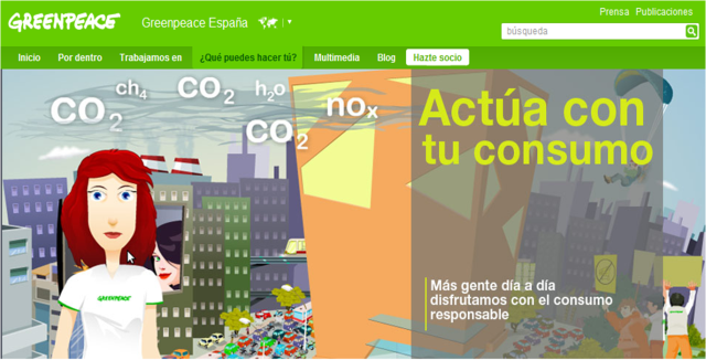 En «Actúa con tu consumo», Greenpeace nos invita, a través de una animación, a realizar un recorrido por la publicidad, las compras o la movilidad, permitiendo reflexionar sobre nuestros comportamientos y realizando propuestas para hacerlos más sostenibles.