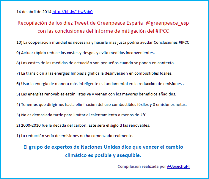 Del «Informe de Mitigación» del Gupo de Trabajo III del IPCC, que se ha presentado en Berlín el día 12 de Abril de 2014, se deduce que vencer el cambio climático es posible y asequible, si se actúa con rapidez, cambiando radicalmente el modelo energético y el estilo de vida.