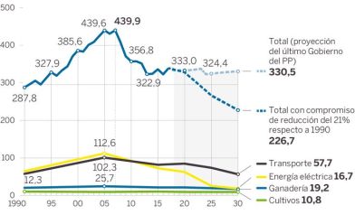 Evolución prevista de la emisión de gases de efecto invernadero en España según el Plan Integrado de Energía y Clima enviado por el Gobierno de España para su revisión por la Comisión Europea.