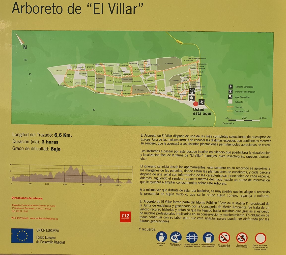 Cuando volvíamos el otro día de Doñana, decidimos hacer un sendero por el Arboreto de El Villar, es un sitio curioso cerca de Bonares, sus 75 ha están organizadas en 90 parcelas destinadas a albergar distintas especies del género eucalipto, a modo de parcelas de ensayo en las que se realizaba el seguimiento y evaluación de la viabilidad de cada una de las especies implantadas, con la finalidad de comprobar su potencial utilización en los programas de repoblación forestal llevados a cabo a lo largo de las décadas de los años 40, 50 y 60 del siglo pasado.