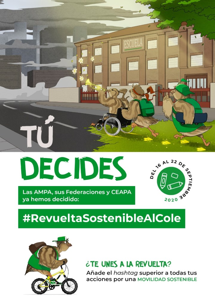 Campaña de CEAPA por una vuelta al cole por medios no contaminantes. Así pueden contribuir las familias a ser parte de la solución y se enmarca en otra más amplia para la conversión de los entornos escolares en áreas de protección de la salud de la infancia a través de una Propuesta no de Ley (PNL). Nuestra ‘Revuelta sostenible al cole’ pretende extenderse en el territorio nacional durante todo el curso escolar, apoyándose en el retorno a las aulas en septiembre, y la Semana Europea de la Movilidad, que se celebra del 16 a 22 de septiembre de 2020.